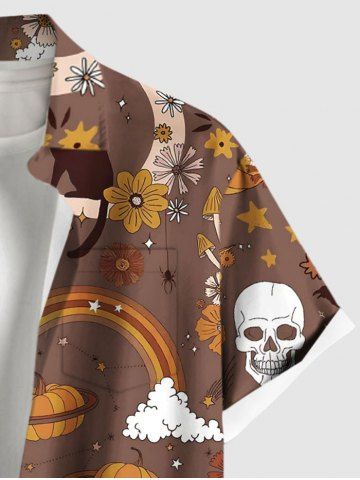 Plus Size Halloween Pumpkin Ghost Skull Flowers Mushroom Print Buttons Pocket Shirt For Men - Light Brown - M