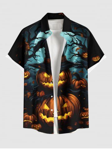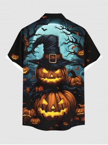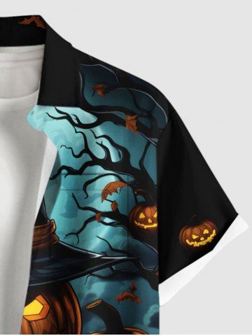 Plus Size Halloween Pumpkin Hat Tree Bat Moon Print Buttons Pocket Shirt For Men - Black - S