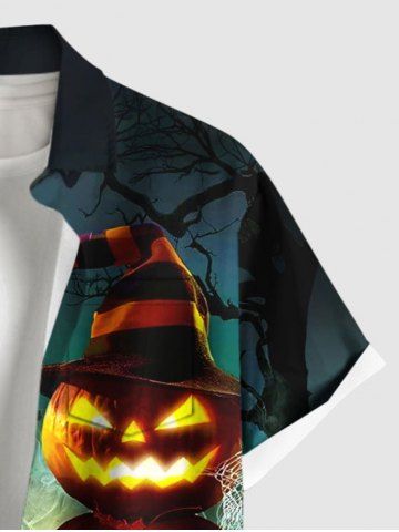 Plus Size Halloween Pumpkin Hat Tree Crow Cross Print Buttons Pocket Shirt For Men - Black - 2xl