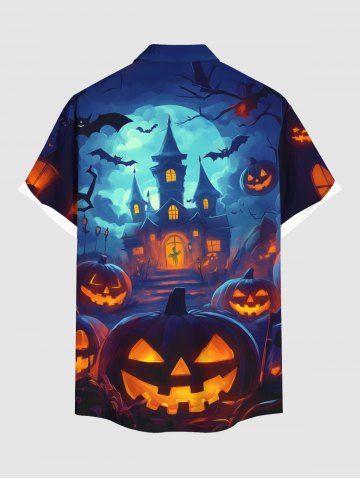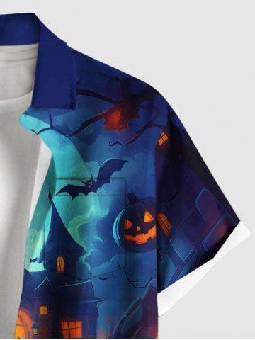 Plus Size Halloween Pumpkin Lantern Bat Moon Castle Print Buttons Pocket Shirt For Men - Blue - 2xl