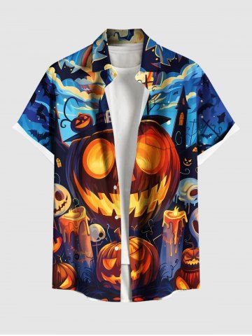 Men > Plus Size Halloween Pumpkin Lantern Bat Skulls Candles Print Buttons Pocket Shirt For Men