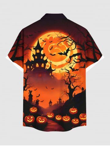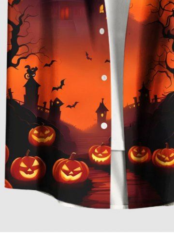 Plus Size Halloween Pumpkin Lantern Moon Bat Trees Print Buttons Pocket Shirt For Men - Orange - Xl