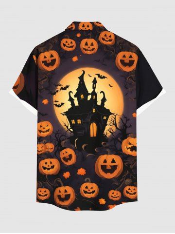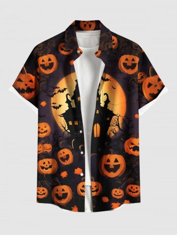 Men > Plus Size Halloween Pumpkin Moon Bat Castle Print Buttons Pocket Shirt For Men