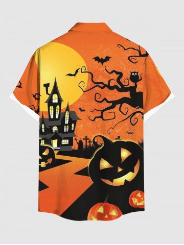 Plus Size Halloween Pumpkin Moon Bat Owl CrossTree Print Buttons Pocket Shirt For Men - Orange - M