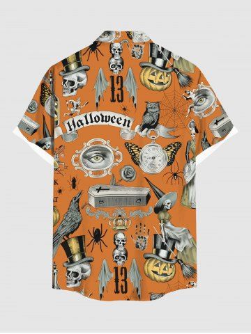 Plus Size Halloween Pumpkin Skull Owl Spider Web Butterfly Clock Eagle Print Buttons Pocket Shirt For Men - Orange - 4xl