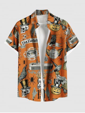 Men > Plus Size Halloween Pumpkin Skull Owl Spider Web Butterfly Clock Eagle Print Buttons Pocket Shirt For Men
