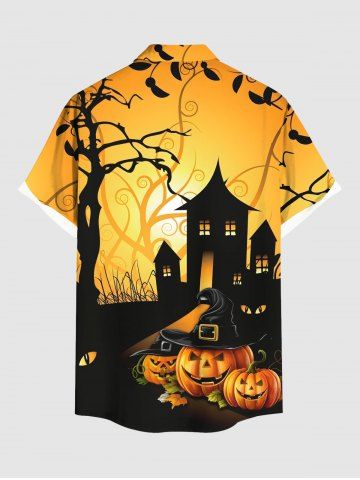 Plus Size Halloween Pumpkin Tree Castle Print Buttons Pocket Shirt For Men - Orange - 3xl