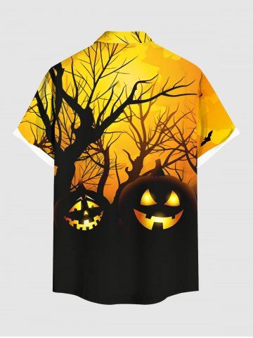 Plus Size Halloween Pumpkin Tree Print Buttons Pocket Shirt For Men - Yellow - L