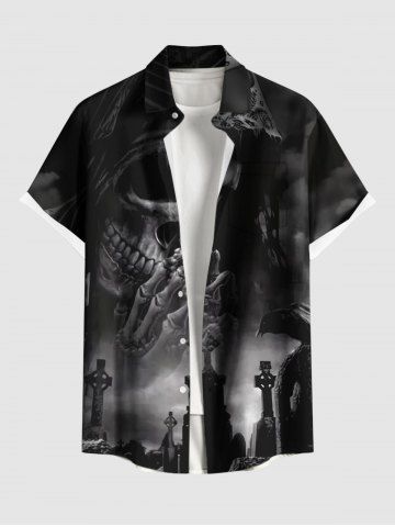 Plus Size Halloween Skull Cross Crow Print Buttons Pocket Shirt For Men - Black - 4xl
