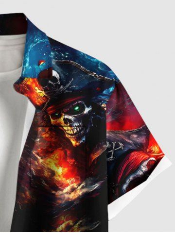 Plus Size Halloween Skull Pirate Sea Waves Ship Fire Flame Print Buttons Pocket Shirt For Men - Red - 5xl