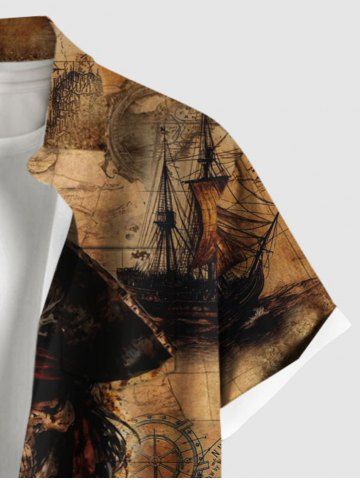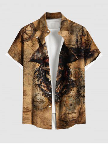 Plus Size Halloween Skull Pirated Ship Rudder Print Buttons Pocket Shirt For Men - Brown - 2xl