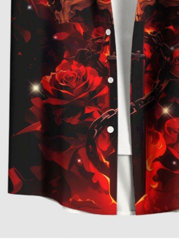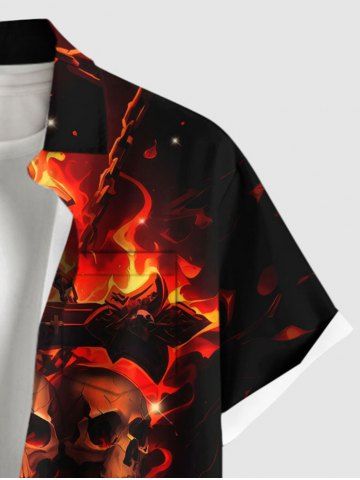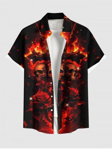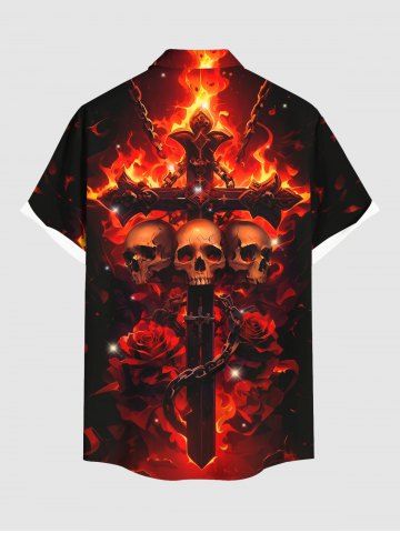 Plus Size Halloween Skulls Fire Flame Rose Flower Cross Print Buttons Pocket Shirt For Men - Black - Xl