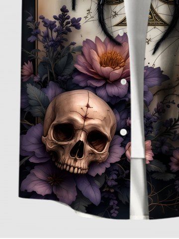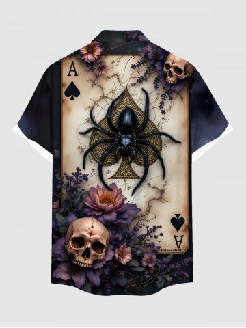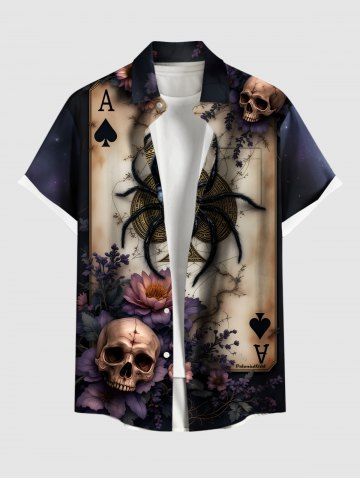 Plus Size Halloween Skulls Flowers Spider Poker Print Buttons Pocket Shirt For Men - Black - M