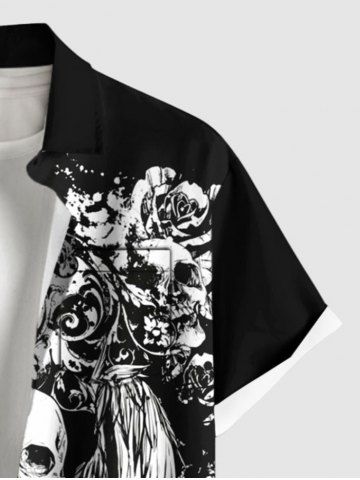 Plus Size Halloween Skulls Flowers Wings Print Buttons Pocket Shirt For Men - Black - 4xl