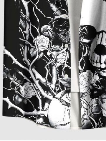 Plus Size Halloween Skulls Rose Flowers Print Buttons Pocket Shirt For Men - Black - S
