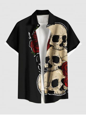 Plus Size Halloween Skulls Rose Flowers Print Buttons Pocket Shirt For Men - Black - 3xl