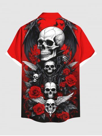 Plus Size Halloween Skulls Wings Rose Flowers Butterfly Print Buttons Pocket Shirt For Men - Red - S