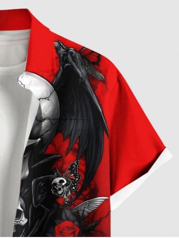 Plus Size Halloween Skulls Wings Rose Flowers Butterfly Print Buttons Pocket Shirt For Men - Red - 3xl