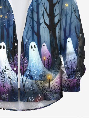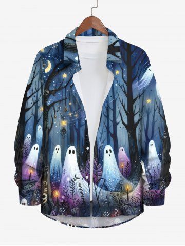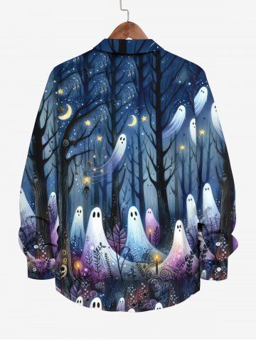Men > Plus Size Halloween Star Moon Forest Ghost Spiders Plants Candles Print Buttons Long Sleeve Shirt For Men