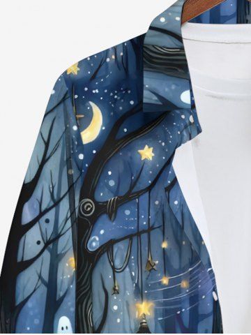 Plus Size Halloween Star Moon Forest Ghost Spiders Plants Candles Print Buttons Long Sleeve Shirt For Men - Blue Gray - 8xl