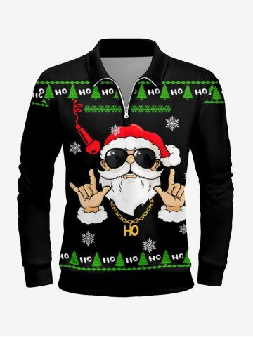 Plus Size Men's Christmas Tree Snowflake Santa Claus Microphone Print Zipper Polo Shirt - Black - Xl