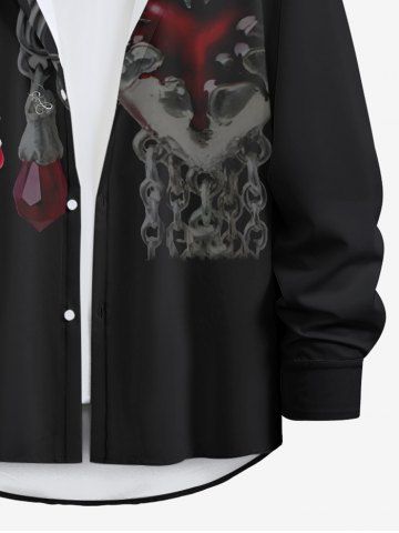 Plus Size Metallic Skull Cracked Heart Chain Tassel Print Halloween Button Shirt For Men - Black - Xl