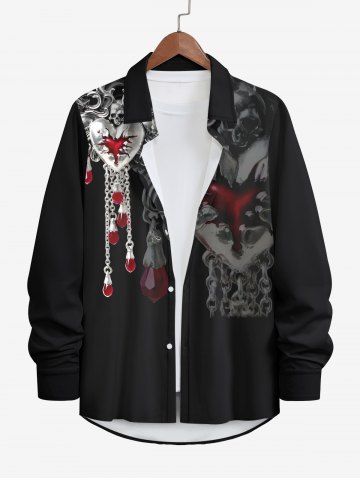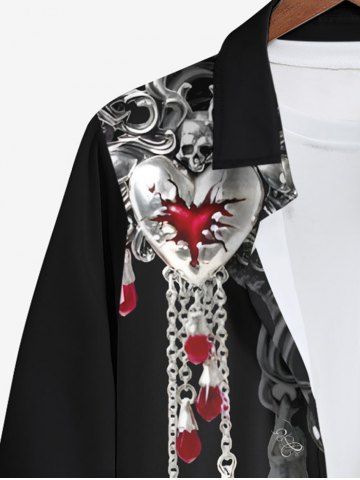 Plus Size Metallic Skull Cracked Heart Chain Tassel Print Halloween Button Shirt For Men - Black - 7xl