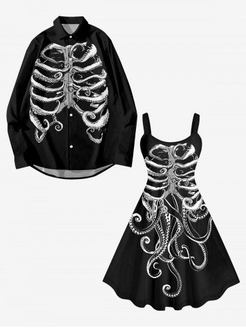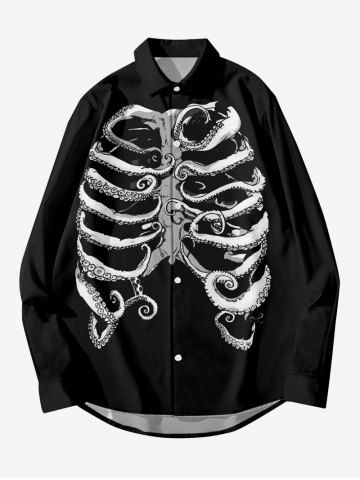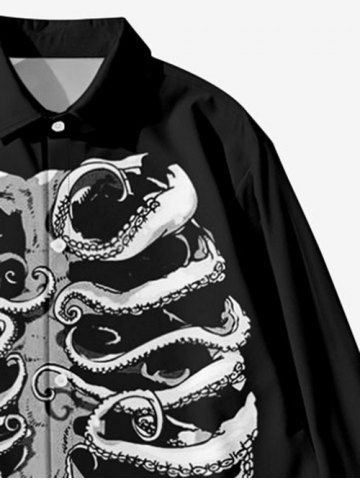 Plus Size Octopus Skeleton Print Halloween Button Shirt For Men - Black - L