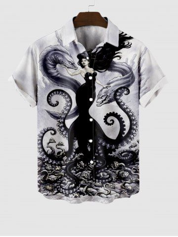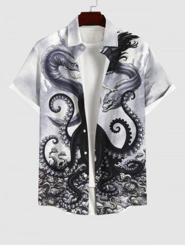 Plus Size Octopus Wizard Snake Monster Ink Painting Print Halloween Button Pocket Shirt For Men - Gray - 3xl