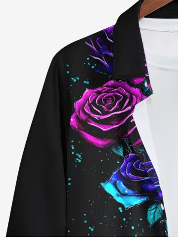 Plus Size Ombre Rose Flower Galaxy Print Halloween Button Shirt For Men - Black - 8xl