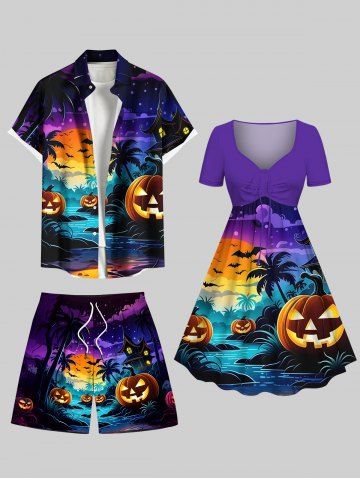 Men > Plus Size Pumpkin Bat Coconut Tree Moon Castle Print Halloween Drawstring Pocket Beach Shorts For Men