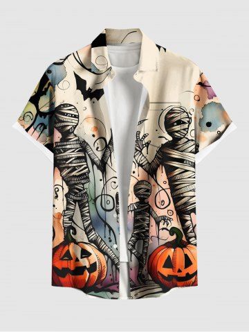 Plus Size Pumpkin Bat Mummy Print Halloween Button Pocket Shirt For Men - Apricot - 2xl
