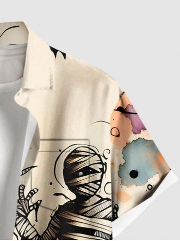 Plus Size Pumpkin Bat Mummy Print Halloween Button Pocket Shirt For Men - Apricot - 6xl