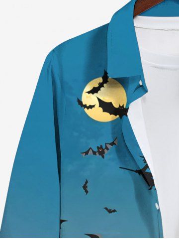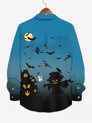Plus Size Pumpkin Castle Ghost Bat Moon Print Halloween Button Shirt For Men - Blue - 7xl