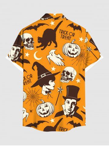 Plus Size Pumpkin Cat Skull Ghost Bat Wizard Spider Web Print Halloween Button Pocket Shirt For Men - Orange - S