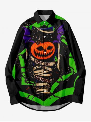 Plus Size Pumpkin Chain Colorblock Print Halloween Button Shirt For Men - Black - L