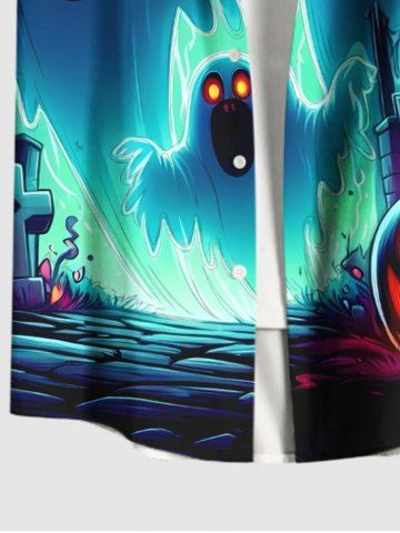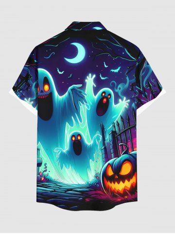 Plus Size Pumpkin Ghost Bat Galaxy Print Halloween Button Pocket Shirt For Men - Blue - S