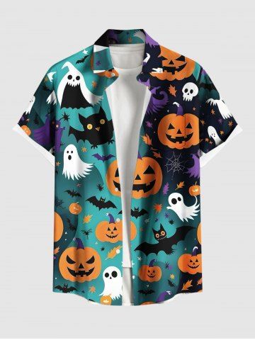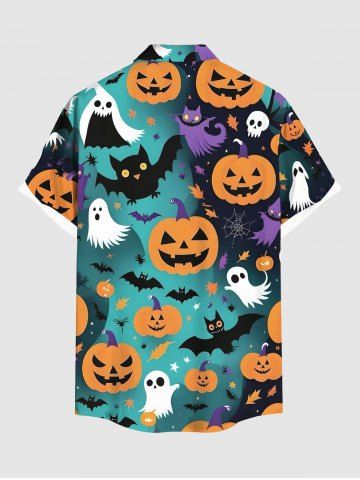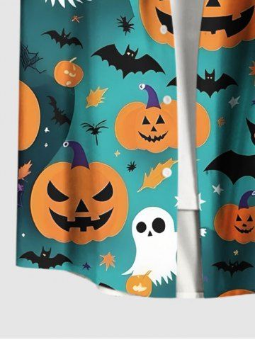 Plus Size Pumpkin Ghost Bat Ombre Spider Web Print Halloween Button Pocket Shirt For Men - Green - Xl