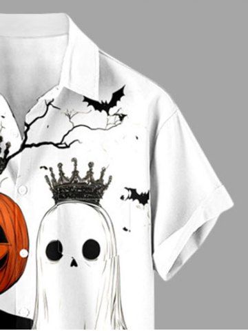 Plus Size Pumpkin Ghost Bride Bridegroom Crown Bat Tree Print Halloween Button Pocket Shirt For Men - White - 3xl