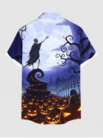 Men > Plus Size Pumpkin Lantern Skeleton Wizard Tree Moon Print Halloween Button Pocket Shirt For Men