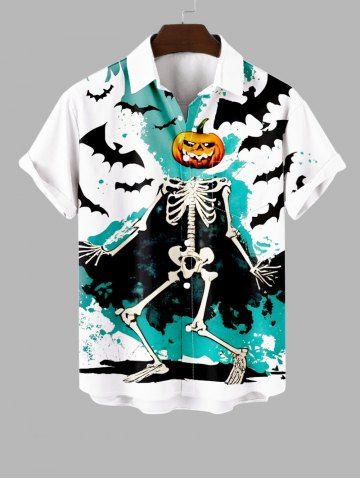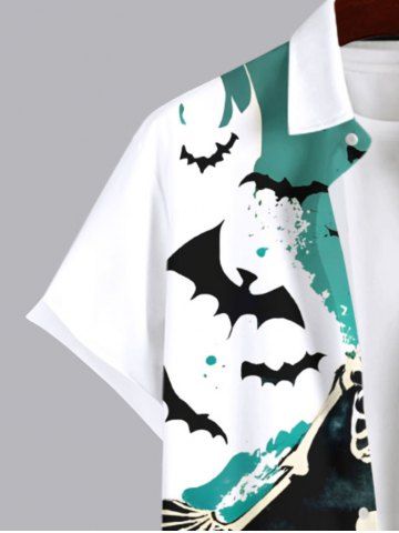 Plus Size Pumpkin Skeleton Bat Painting Splatter Print Halloween Button Pocket Shirt For Men - White - 3xl