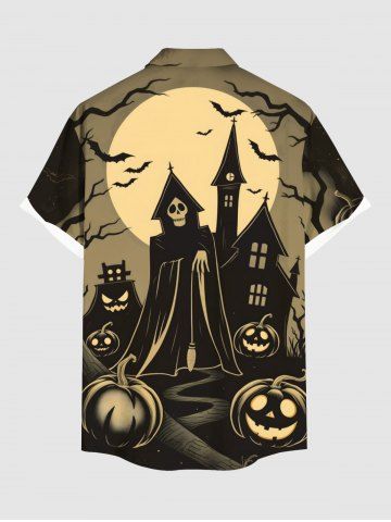 Plus Size Pumpkin Skull Castle Bat Tree Moon Print Halloween Button Pocket Shirt For Men - Black - 3xl