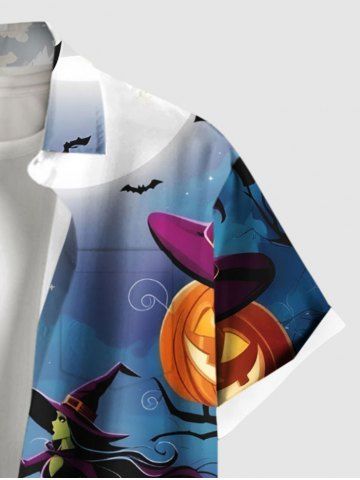 Plus Size Pumpkin Wizard Bat Moon Ombre Galaxy Print Halloween Button Pocket Shirt For Men - Sky Blue - 2xl