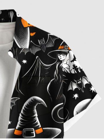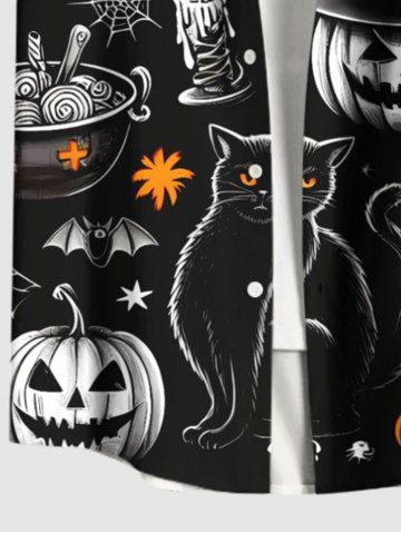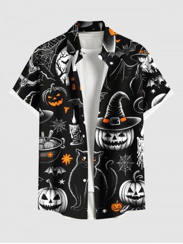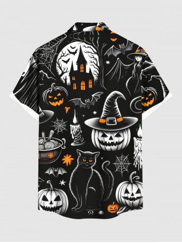 Plus Size Pumpkin Wizard Cat Spider Web Bat Castle Print Halloween Button Pocket Shirt For Men - Black - S