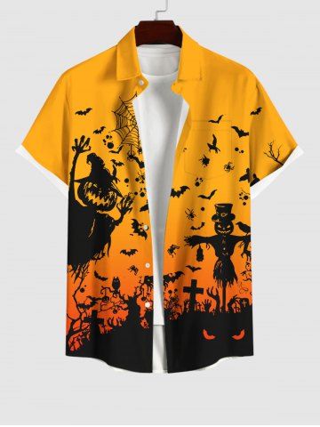 Men > Plus Size Pumpkin Wizard Cross Bat Spider Web Print Halloween Ombre Button Pocket Shirt For Men