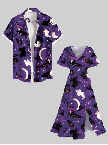Plus Size Pumpkin Wizard Ghost Moon Star Ombre Galaxy Print Halloween Button Pocket Shirt For Men - Purple - Xl