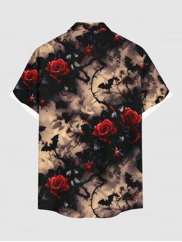 Plus Size Rose Flower Bat Dark Style Print Halloween Button Pocket Shirt For Men - Coffee - L