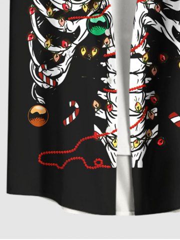 Plus Size Skeleton Christmas Tree Ball Bell Light Candy Print Button Pocket Shirt For Men - Black - S