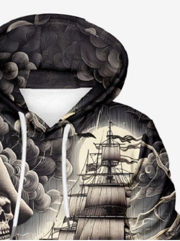 Men > Plus Size Skull Pirate Sea Waves Ship Print Pocket Drawstring Hoodie