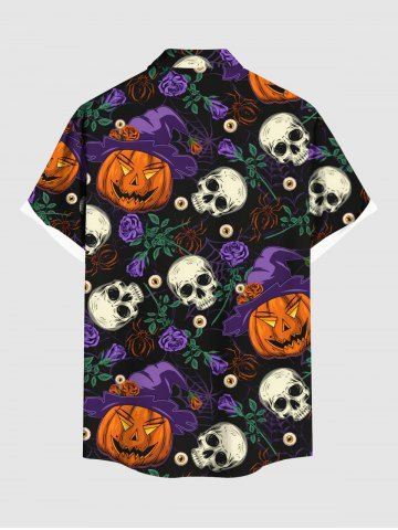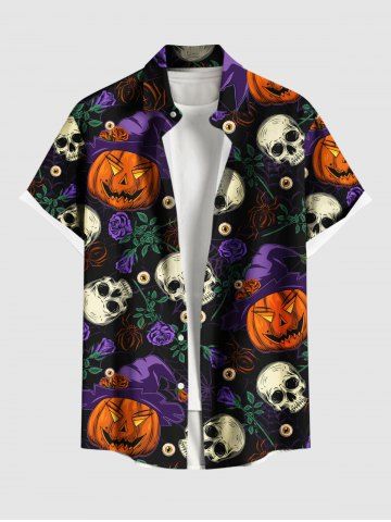 Plus Size Skull Pumpkin Flower Leaf Branch Print Halloween Button Pocket Shirt For Men - Black - M